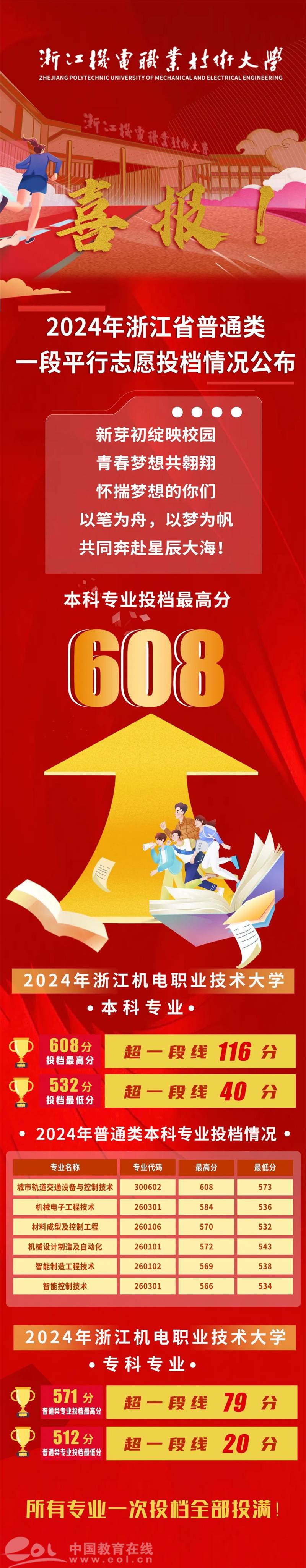 [中国教育在线]浙江机电职业技术大学2024年浙江省普通类一段平行志愿投档情况出炉