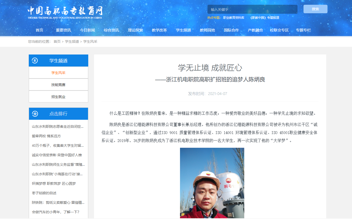 [中国高职高专教育网]学无止境 成就匠心——浙江机电职院高职扩招班的追梦人陈炳良