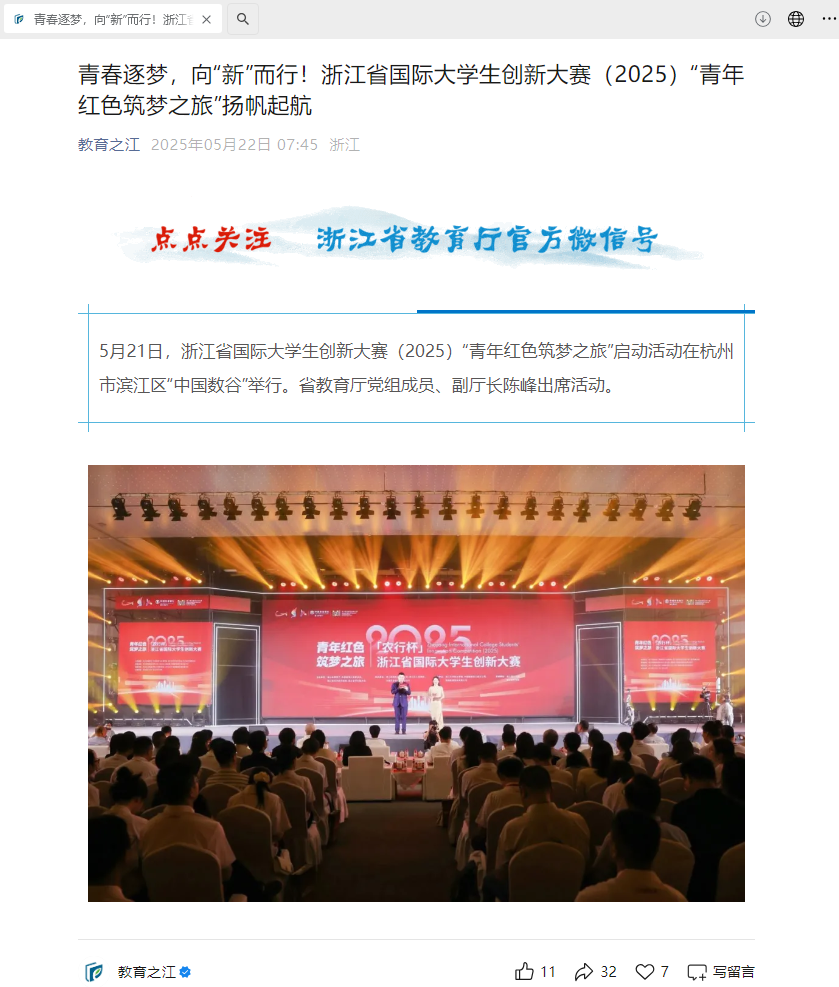 为深入贯彻落实习近平总书记给中国国际大学生创新大赛参赛学生代表的重要回信和给大赛“青年红色筑梦之旅”大学生重要回信精神,引导青年学子扎根中国大地,在传承红色基因中筑牢信仰根基,在服务国家战略中贡献青春力量,用创新创业的生动实践奋力谱写中国式现代化浙江新篇,5月21日下午,“农行杯”浙江省国际大学生创新大赛(2025)“青年红色筑梦之旅”启动活动在杭州市滨江区“中国数谷”举行。活动由浙江省教育厅、共青团...