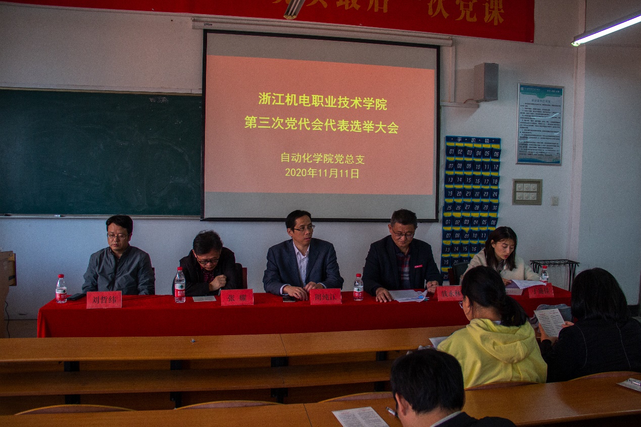 为确保学校党代会按期高质量顺利召开,根据学校第三次党代会筹备工作统筹安排,11月11日下午,自动化学院党总支在13#416教室召开全体党员大会,选举浙江机电职业技术学院第三次党代会代表,会议由党总支书记钱永林主持。大会应到45人,实到44人,超过应到党员人数的五分之四,符合选举法定人数。自动化学院党总支副书记于施佳宣读选举办法(草案),与会党员讨论草案并举手表决,民主通过选举办法,随后举手表决监票人、计票人...