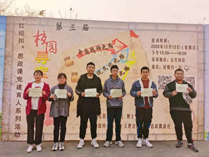 12月13日,由马克思主义学院、学工部(学生处)、团委主办,中国特色社会主义理论读书会、思政微语社承办的“红纽扣”党建育人品牌系列活动暨第三届校园寻宝大赛在我校长安校区举行,共有来自2020级不同专业的36个小组同学参加比赛。校园寻宝大赛以“弘扬中国精神,争做薪火传人”、“传承优秀文化,涵养清风正气”、”喜迎全面小康,青春奋斗有我”三个主题为引领,分别设置了红线——中国精神之路、蓝线——传统文化之路、黄...