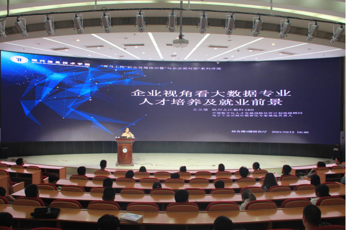 为让学生重视专业与职业能力发展,开拓学生视野,现代信息技术学院组织开展“青马工程”职业发展培训暨“与企业面对面”系列讲座活动。10月12日晚,在综合楼4楼报告厅举行了 “企业视角看大数据专业人才培养及就业前景” 为主题的讲座,特邀杭州之江数科CEO、中国数字化人才发展战略伙伴计划高级顾问、电子工业出版社数智化专家基地负责人王立斐女士主讲。学院学工办主任毋琦、学生党员、入党积极分子、团学干部、大数据专业学...